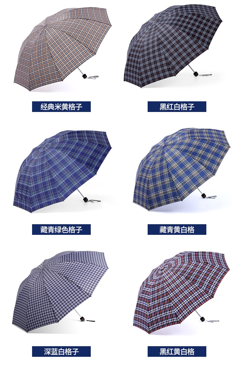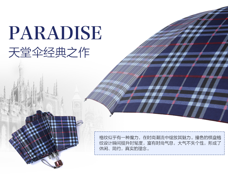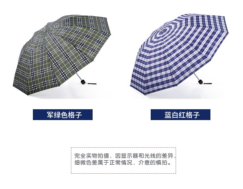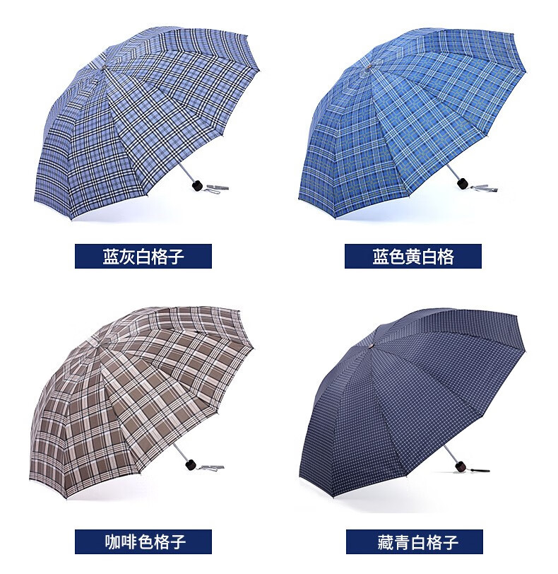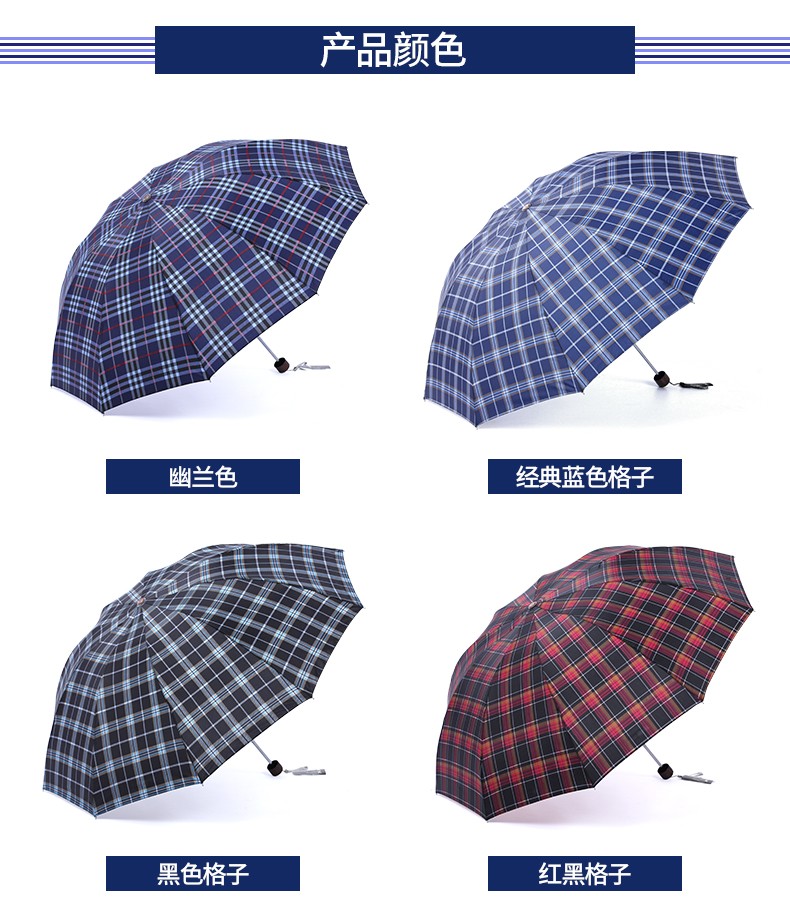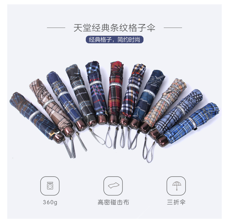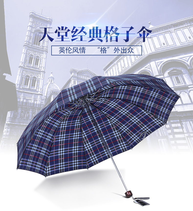 天堂伞格子伞男女士三折叠伞超大号十骨双人商务伞遮阳伞两用晴雨伞 幽蓝色 自营