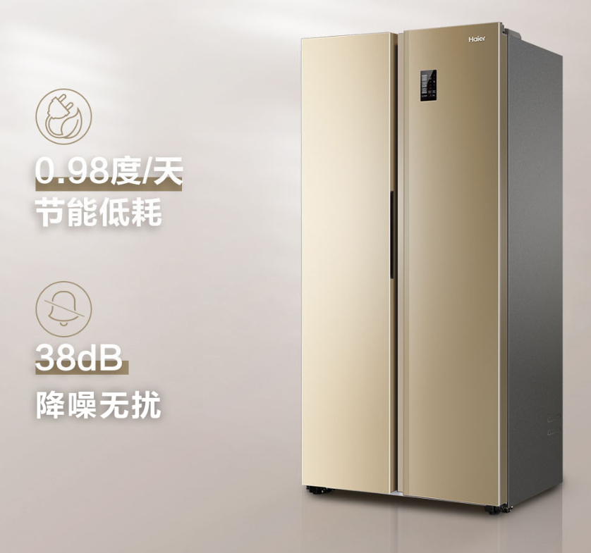 海尔(Haier)480升风冷无霜对开门双开门超大容量超薄家用电冰箱90°悬停门双变频金色BCD-480WBPT 自营