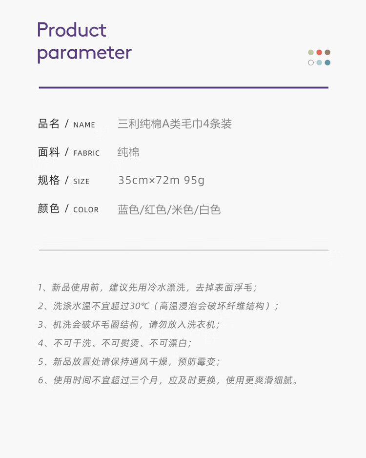 三利新疆长绒棉毛巾 纯棉A类洗脸毛巾4条装 全棉柔软吸水洁面巾 35*72cm 蓝/红/米/白 自营