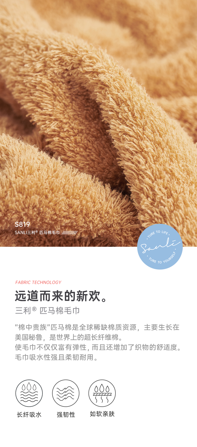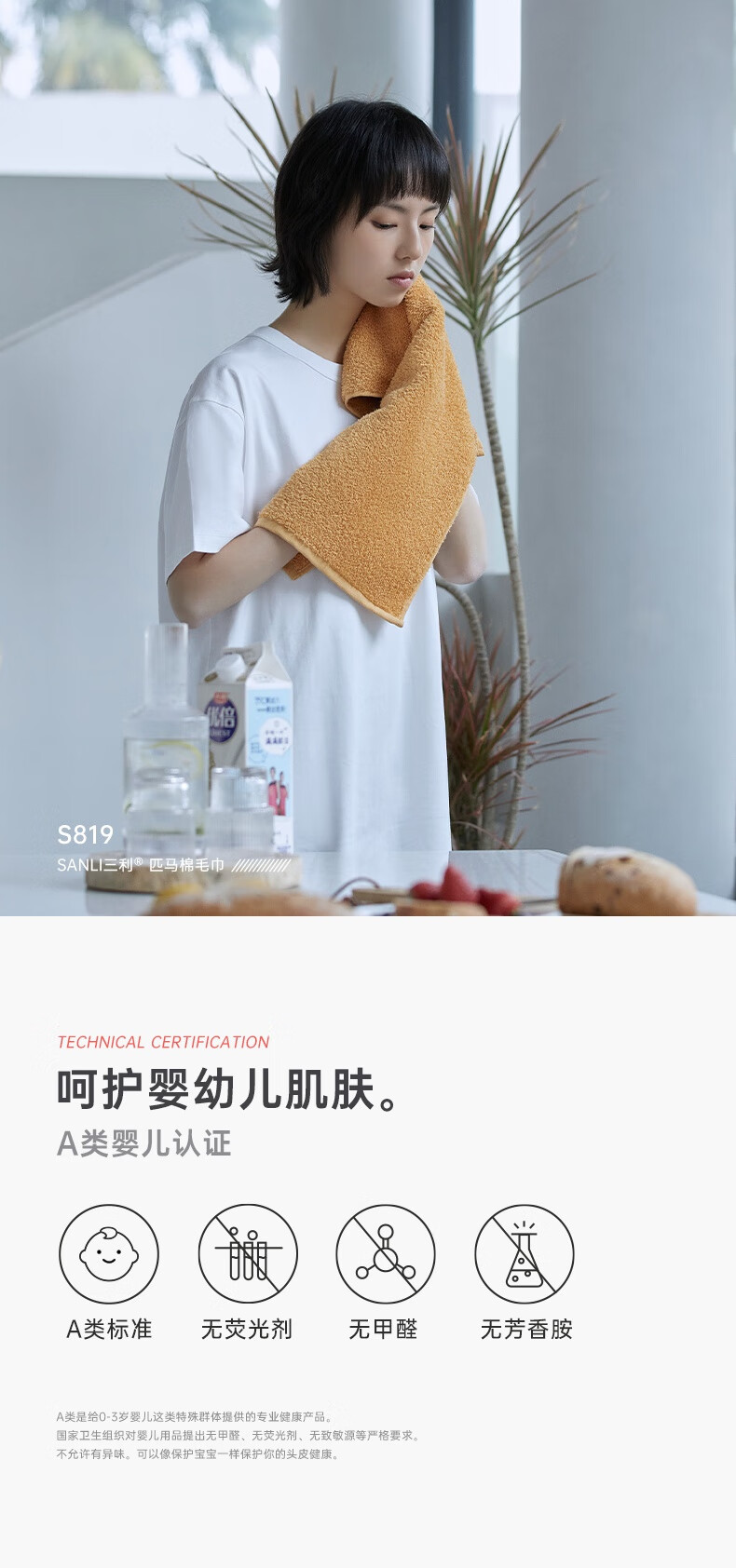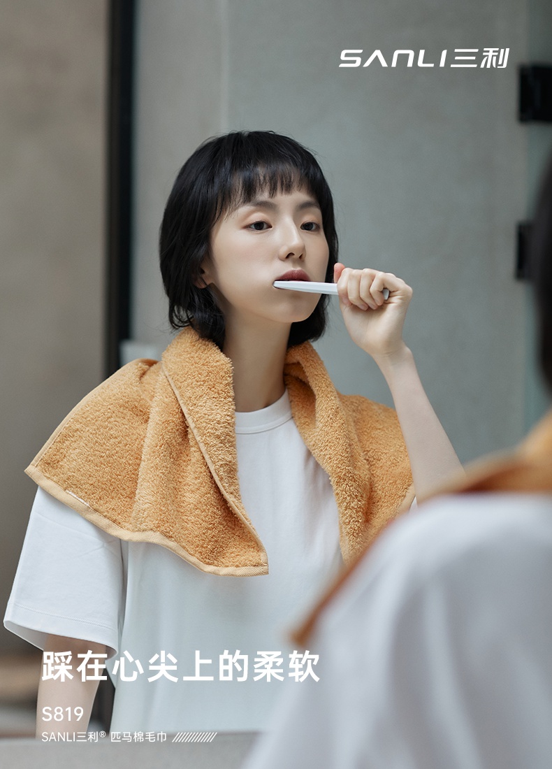 三利抗菌毛巾 纯棉柔软洗脸巾家用吸水男女加厚面巾高毛圈匹马棉大毛巾 35*78cm 130g 姜黄色 自营
