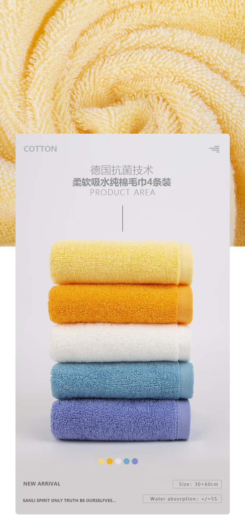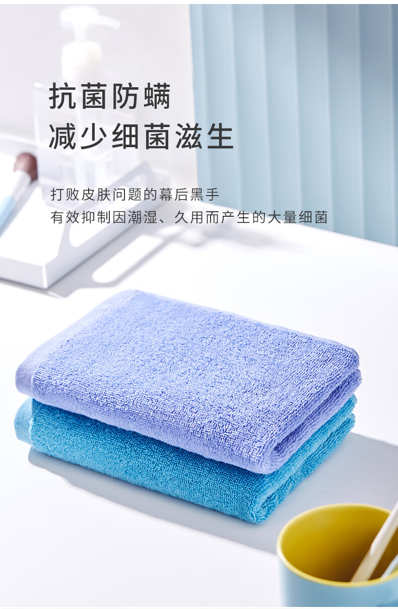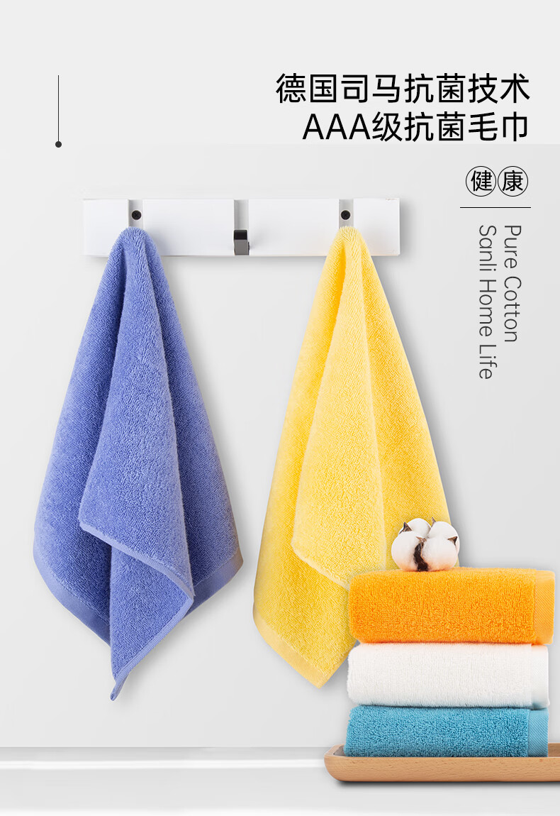 三利抗菌毛巾5条装 纯棉A类柔软吸水小毛巾男女成人儿童面巾洗脸巾 60*30cm 青/蓝/橘/黄/白 自营