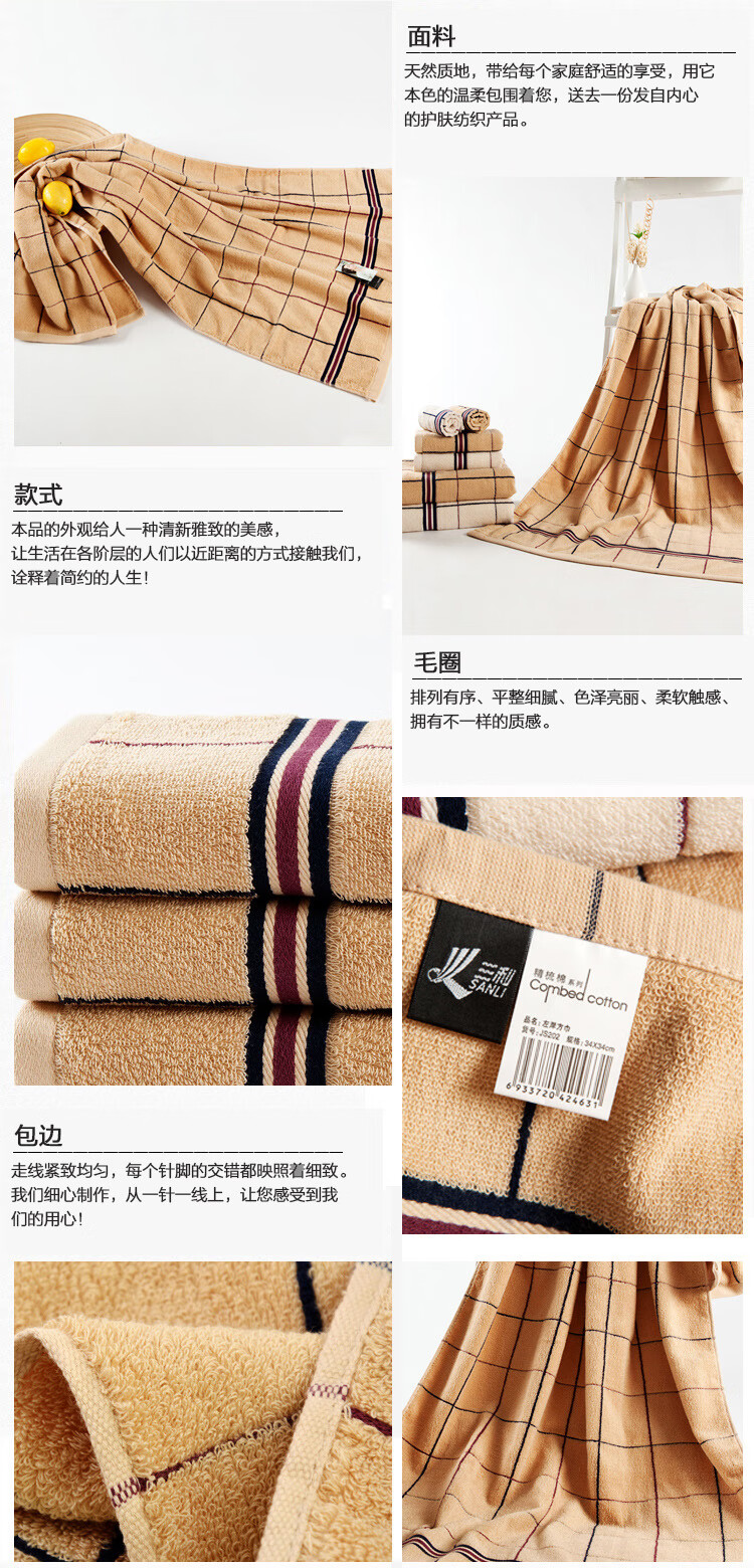 三利 精梳棉系列缎档格纹方巾毛巾浴巾 三件套 象牙白 自营