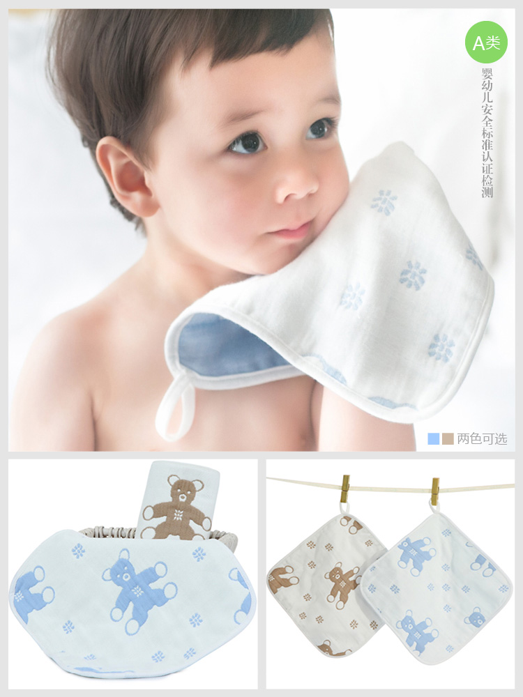三利 纯棉高密度纱布婴幼儿口水巾 A类安全标准 手绢擦汗巾 带挂绳方巾 卡通熊2条装26×26cm 自营