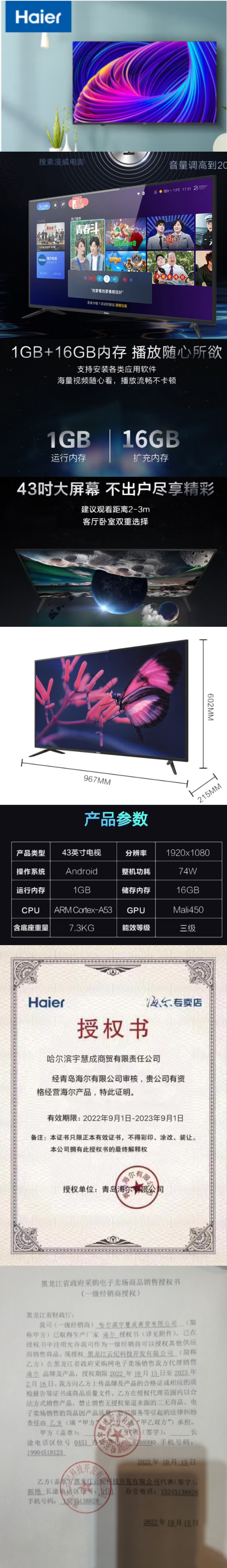 海尔(Haier) 海尔(haier)43英寸全高清智能语音网络液晶平板电视 卧室家用大内存电视 43英寸高清全面屏WIFI智能电视LE43C61 自营