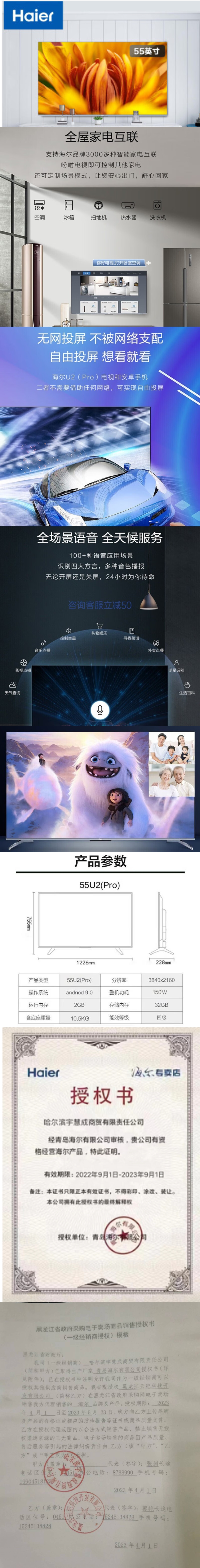 海尔(Haier) 超高清4K平板电视 8K解码远扬语音全面屏电视彩电 液晶电视机 55吋 8K解码 远场语音55U2(PRO) 自营