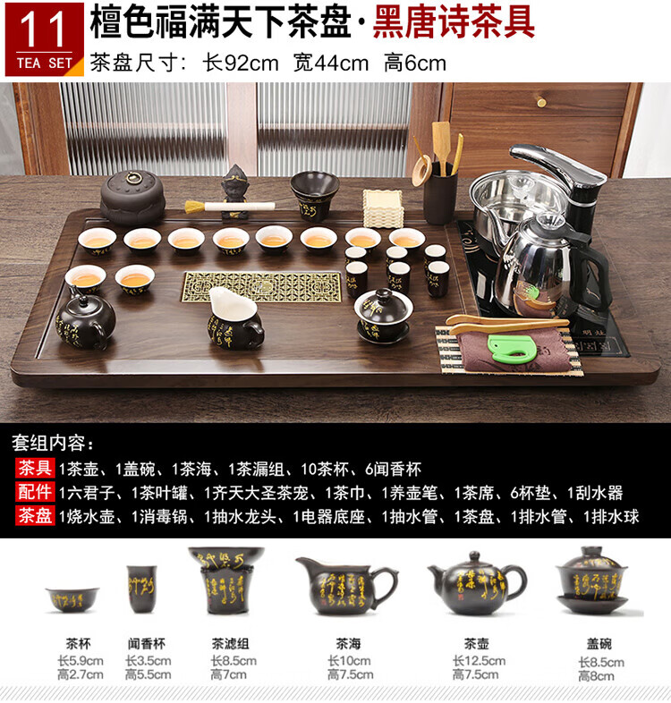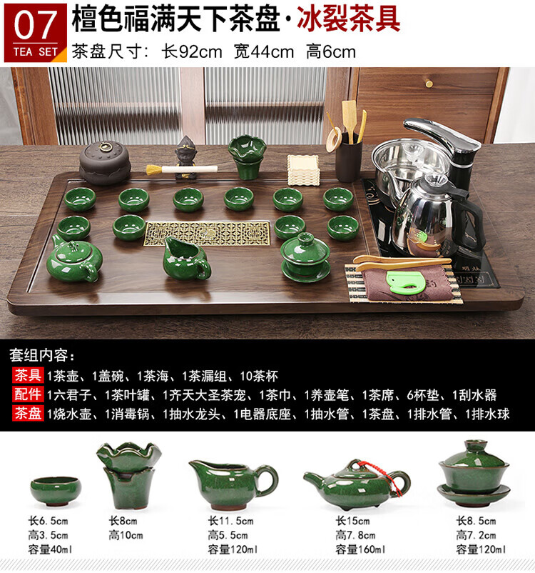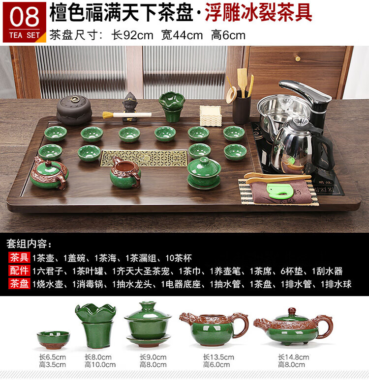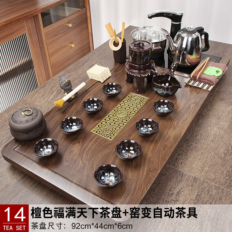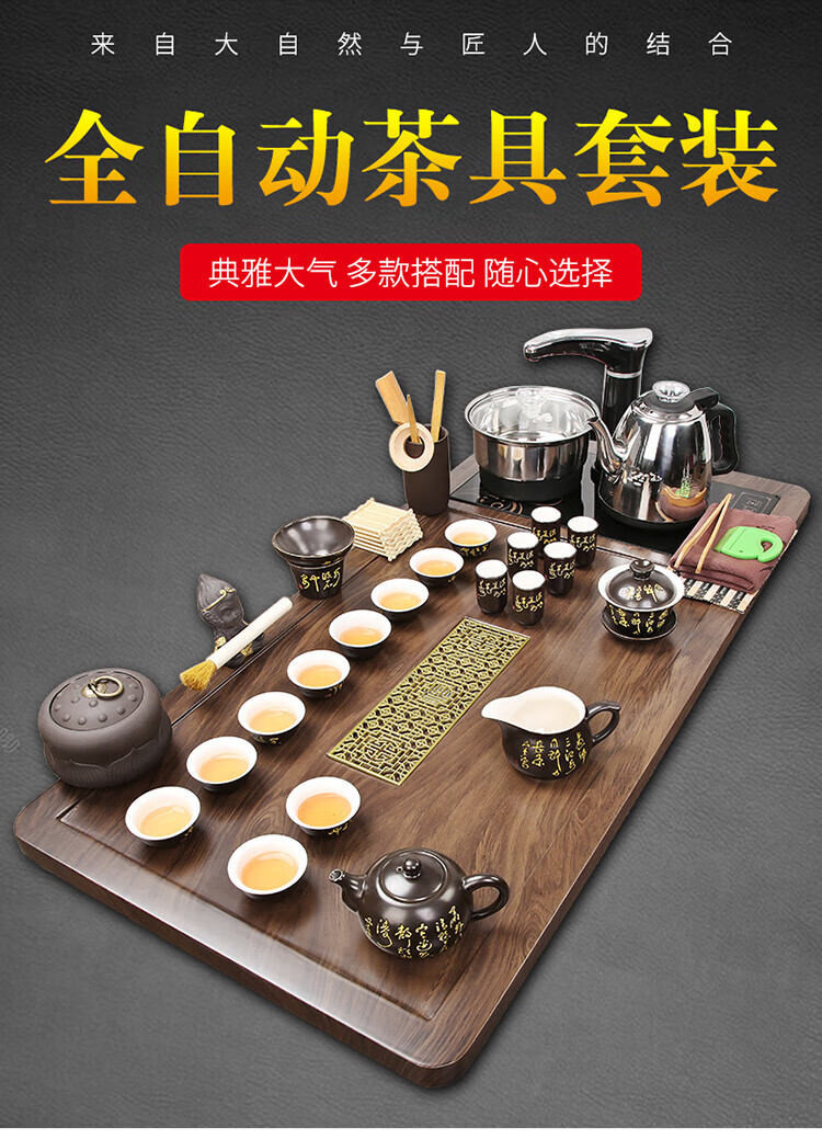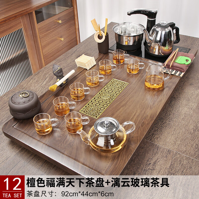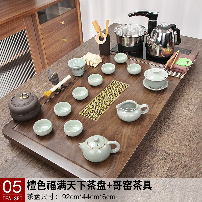 青经全自动茶盘茶具套装烧水壶一体泡茶台家用办公室大茶海整套茶具 07檀色福满天下茶盘+冰裂茶具+黑 自营