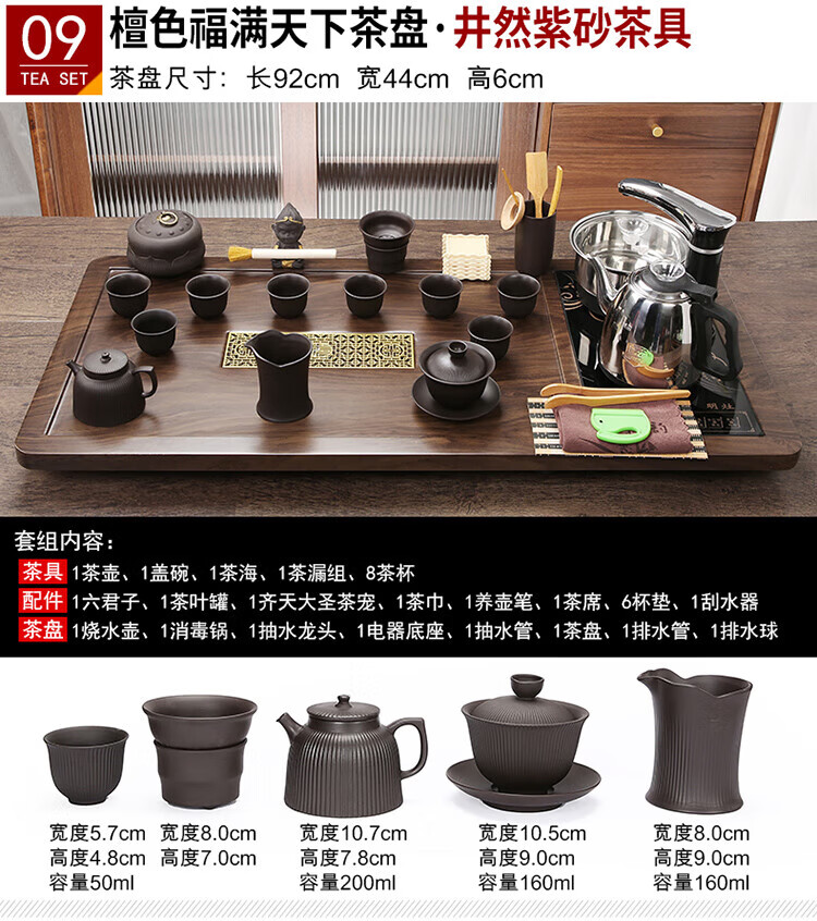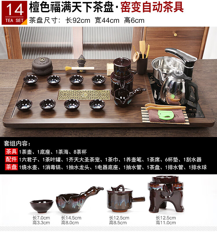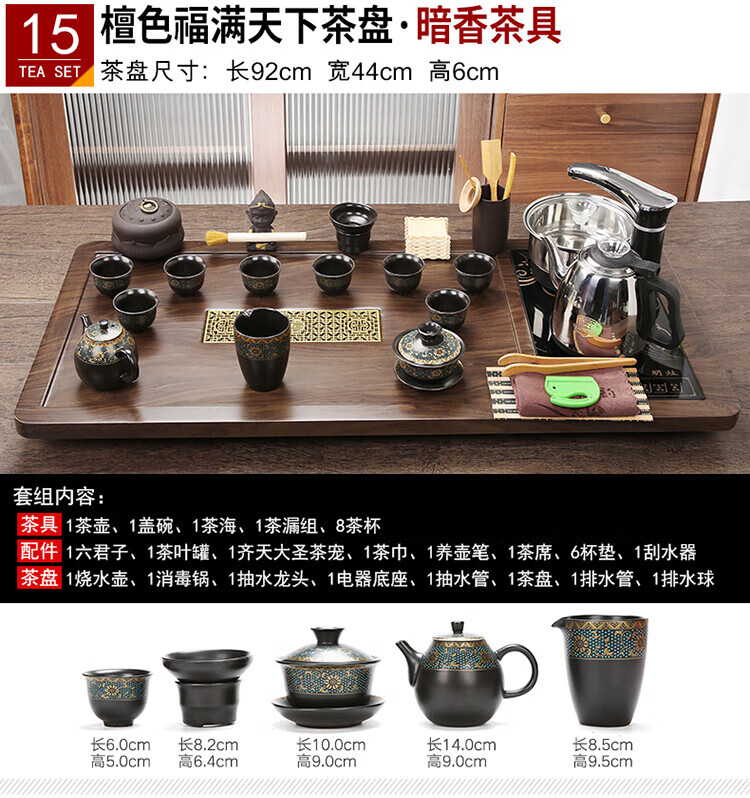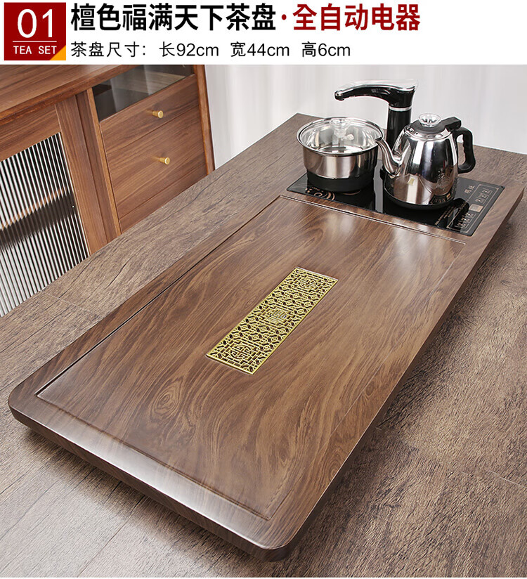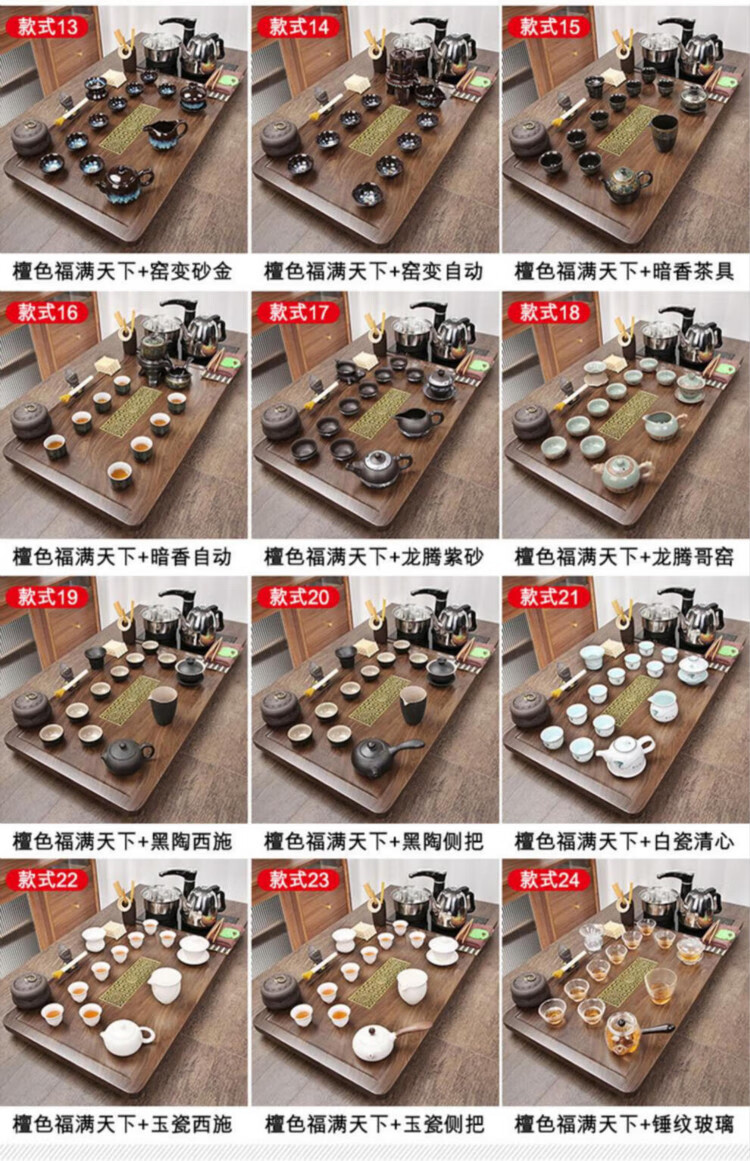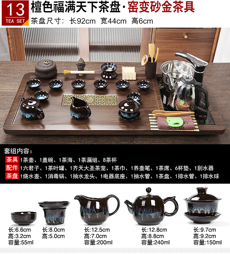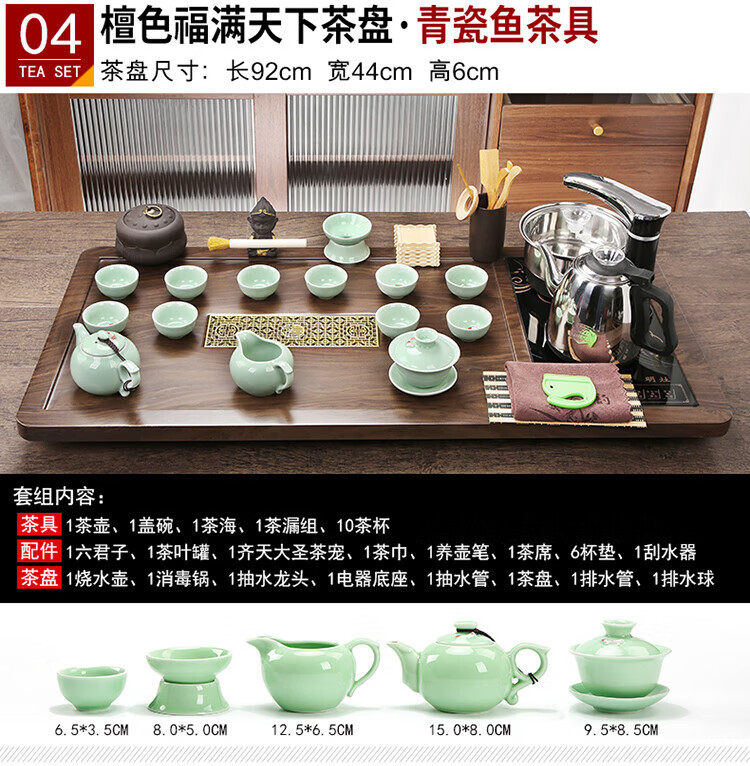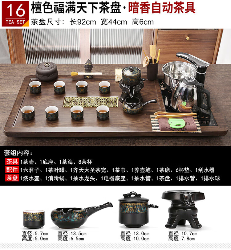 青经全自动茶盘茶具套装烧水壶一体泡茶台家用办公室大茶海整套茶具 07檀色福满天下茶盘+冰裂茶具+黑 自营