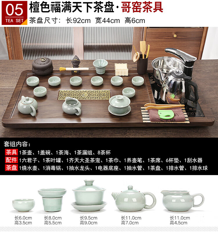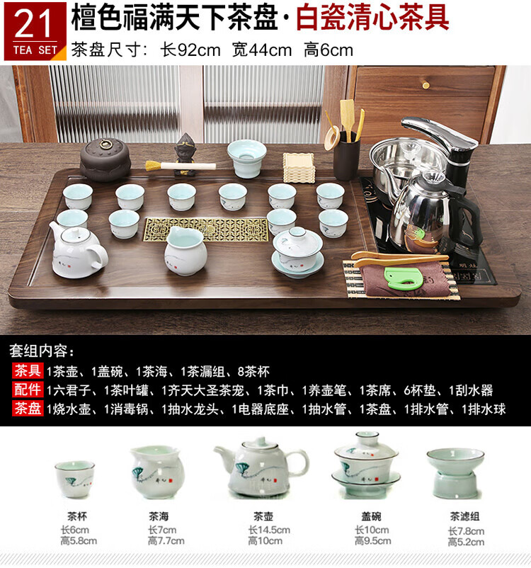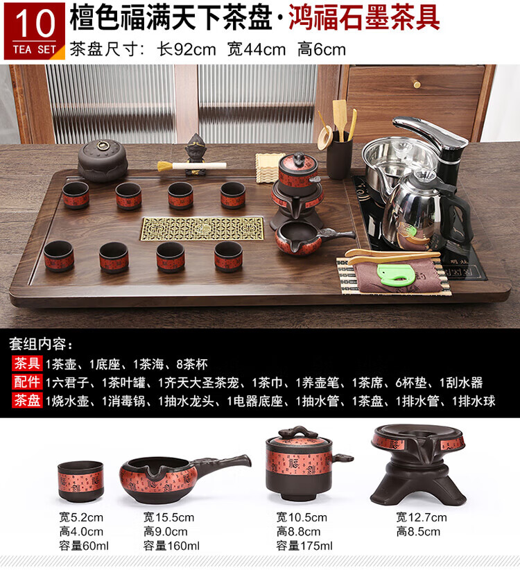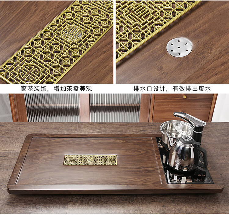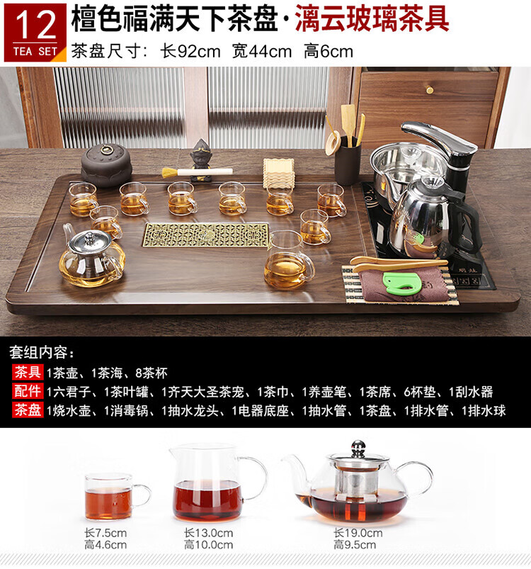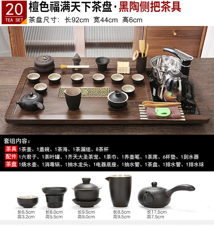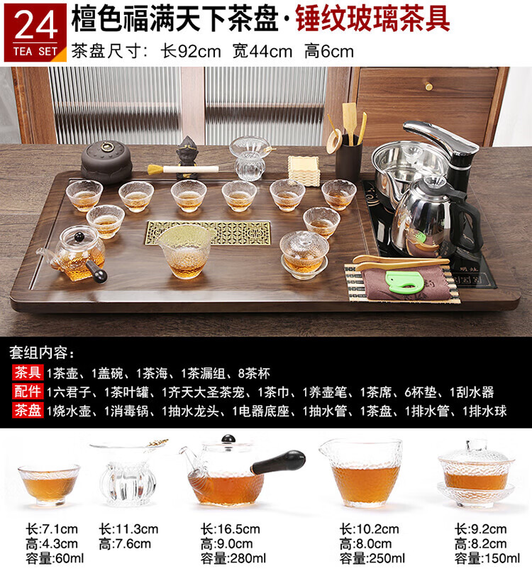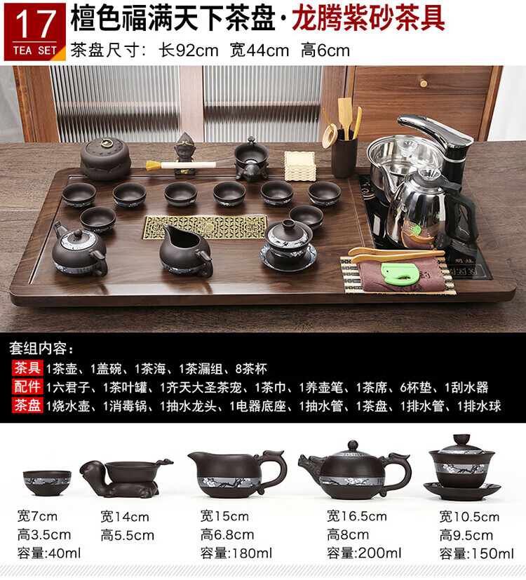 青经全自动茶盘茶具套装烧水壶一体泡茶台家用办公室大茶海整套茶具 07檀色福满天下茶盘+冰裂茶具+黑 自营