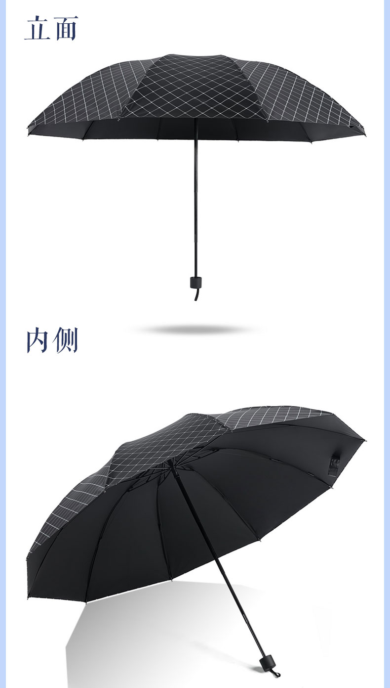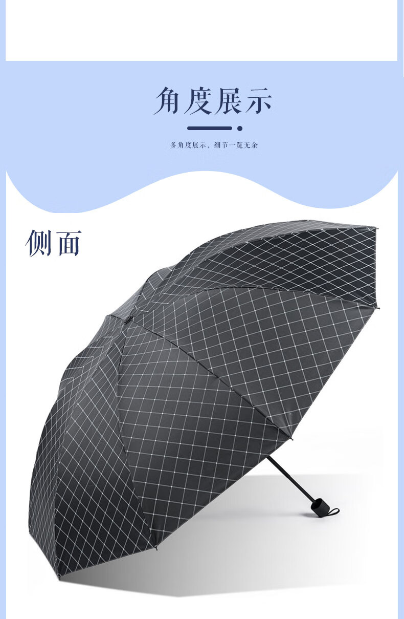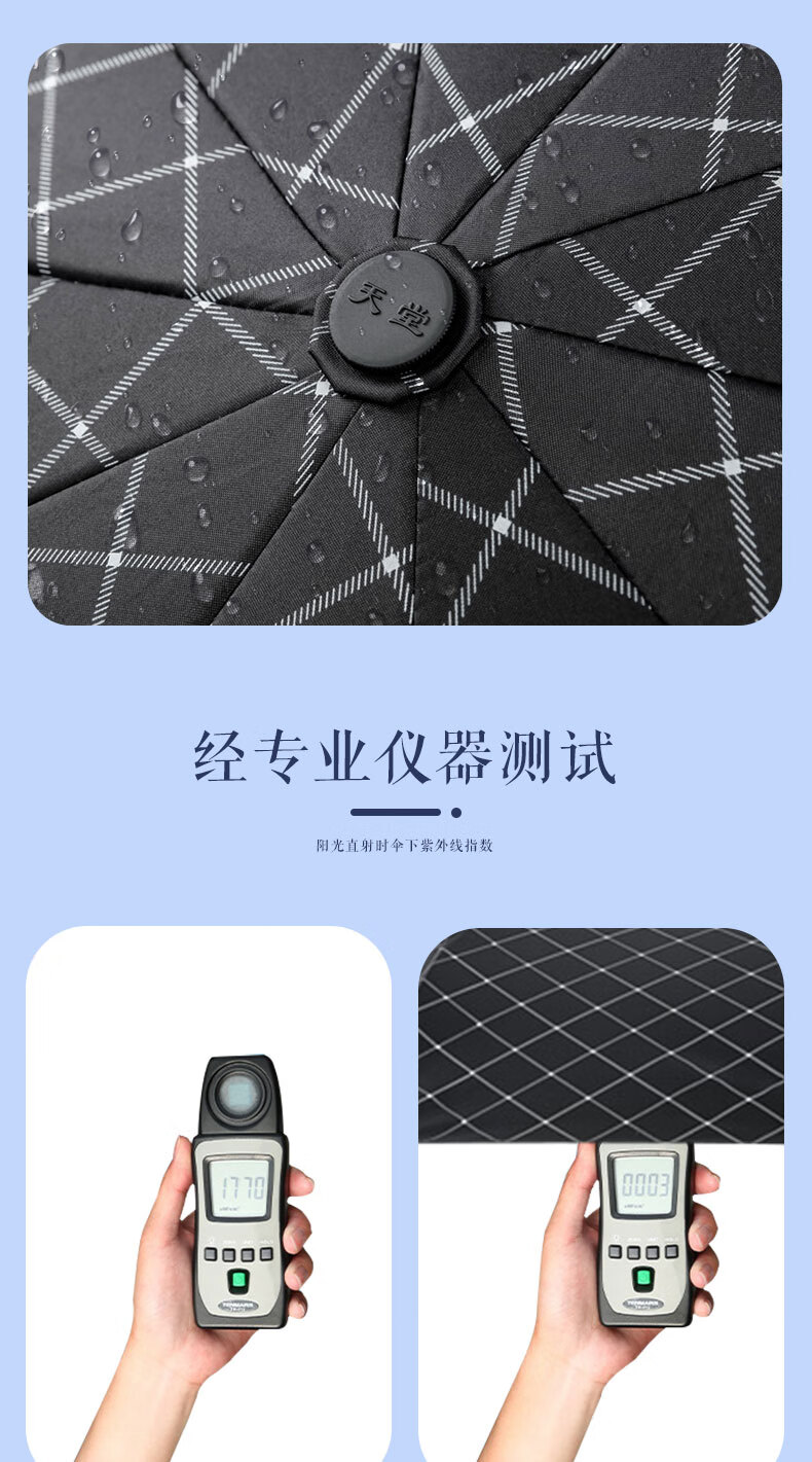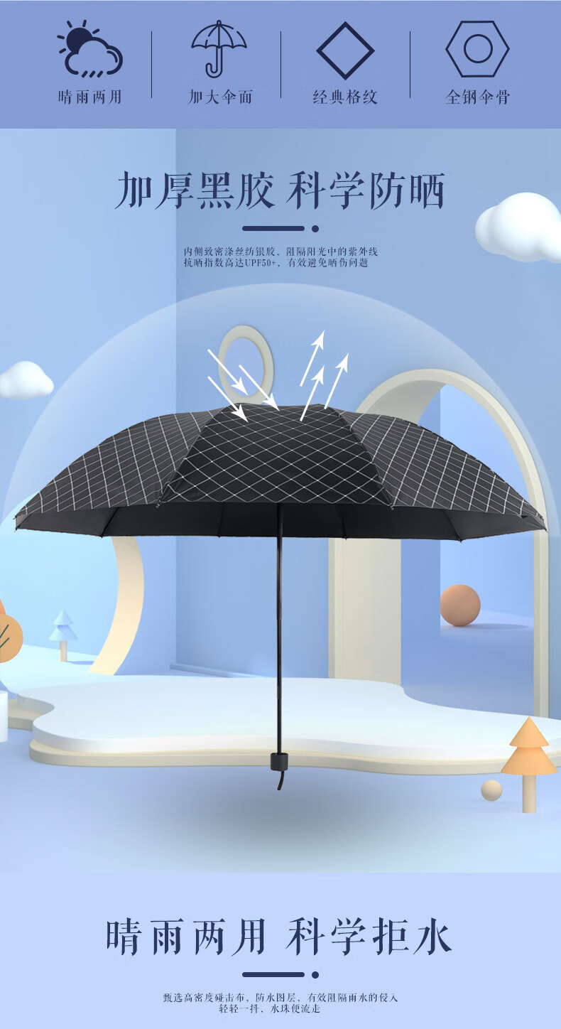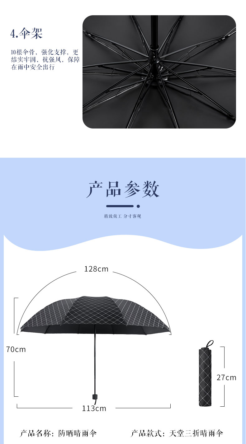 天堂伞十骨加大加固黑胶防晒防紫外线晴雨两用伞三折伞防风遮阳伞男士女士格子伞商务伞2-3人使用 菱致黑格【黑色】 64cmX10骨 自营