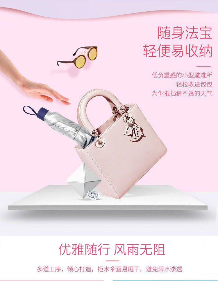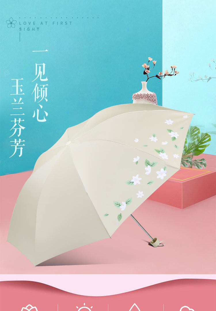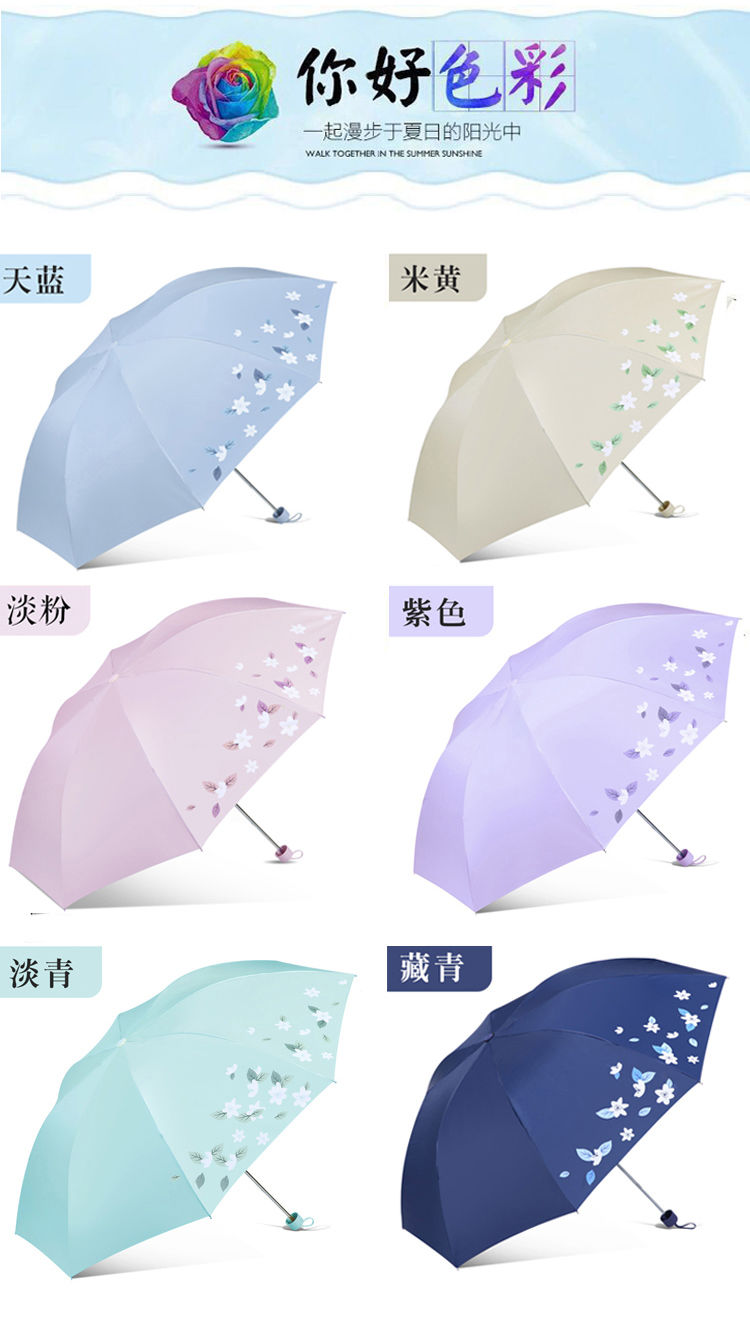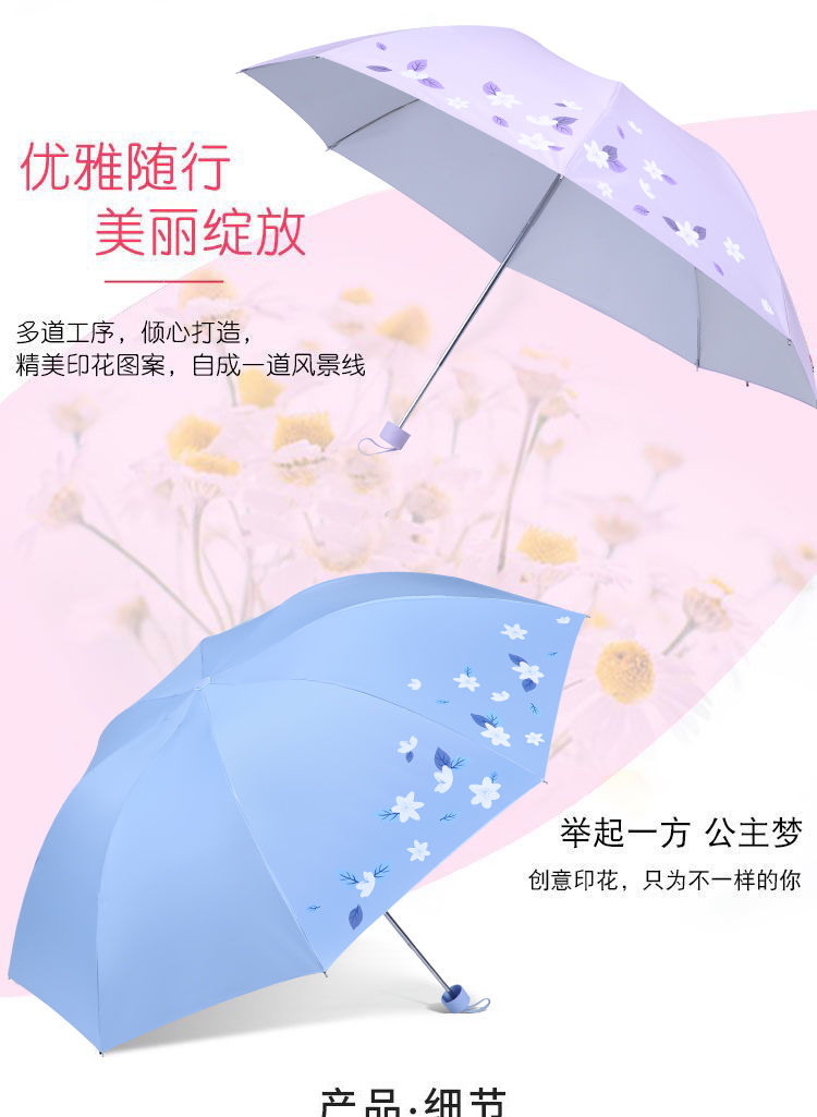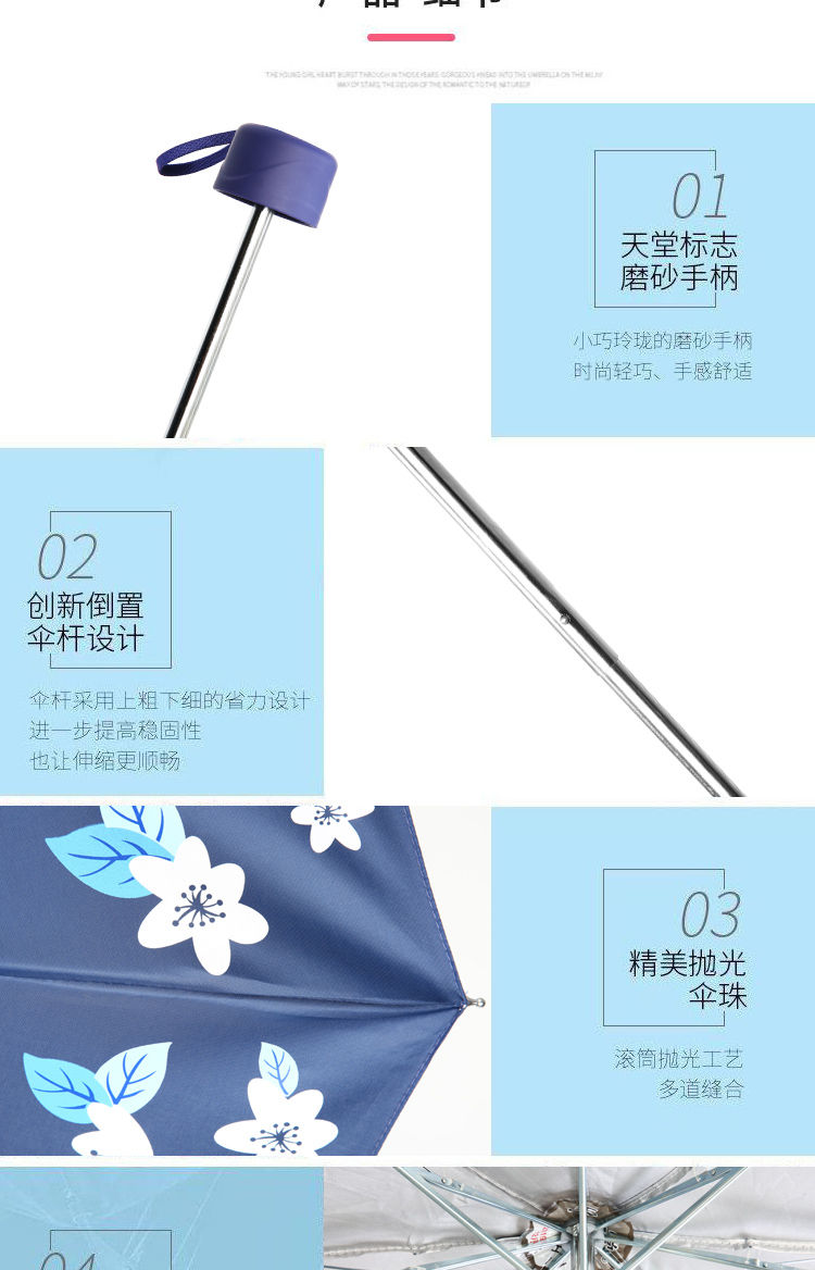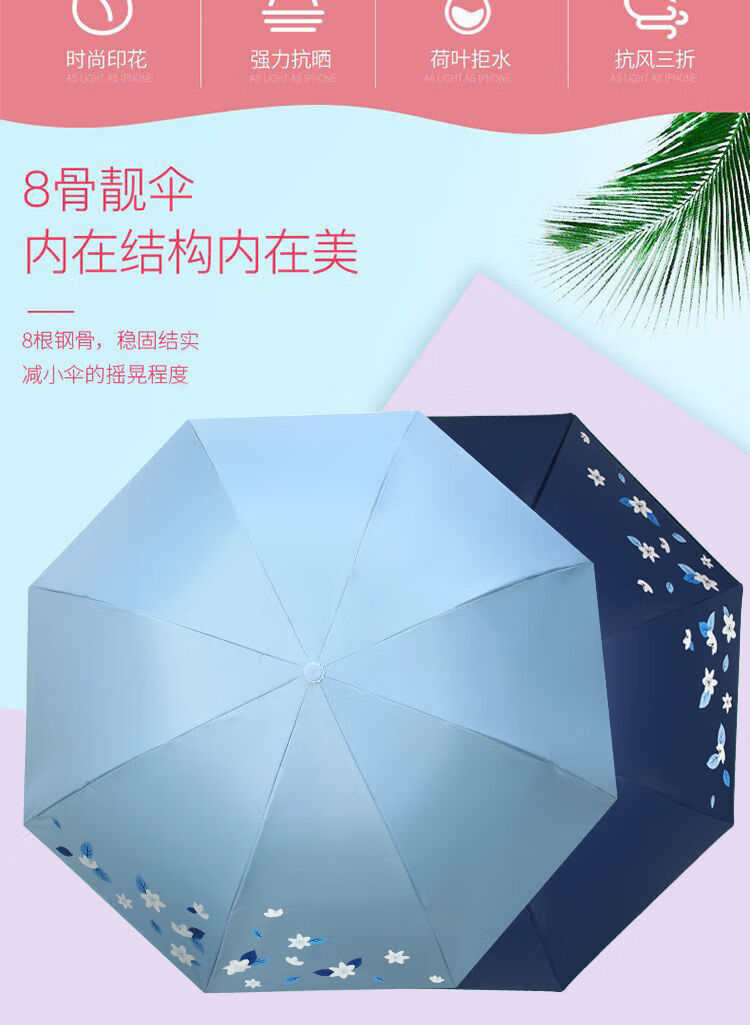 天堂伞旗舰 黑胶防晒防紫外线五折口袋胶囊伞小巧轻便晴雨两用太阳伞女 花兔烂漫蓝色