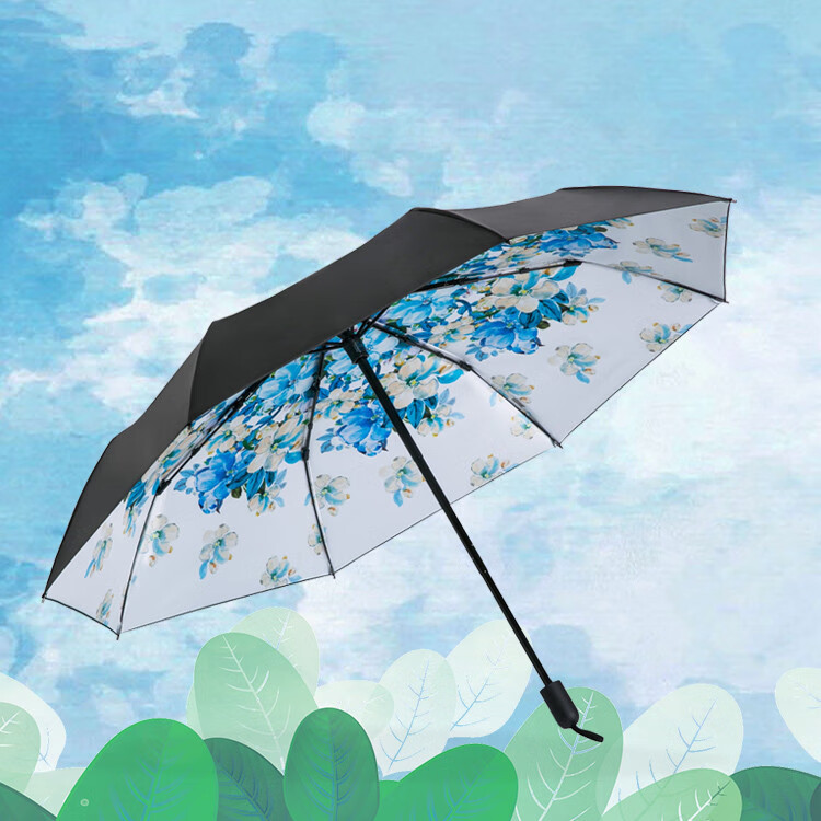 天堂伞 全遮光黑胶转印55cm*8骨三折晴雨伞32247E蔚兰色 自营
