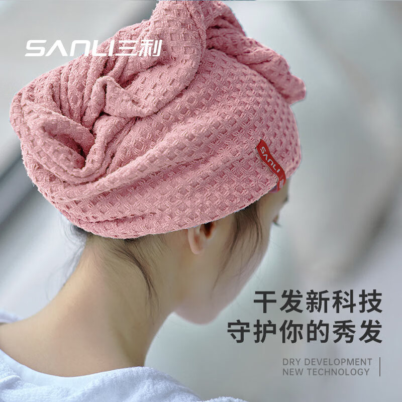 三利干发帽 抗菌柔软吸水双扣干发巾华夫格透气速干护发帽可爱女擦头发毛巾礼盒装 25*76 粉色