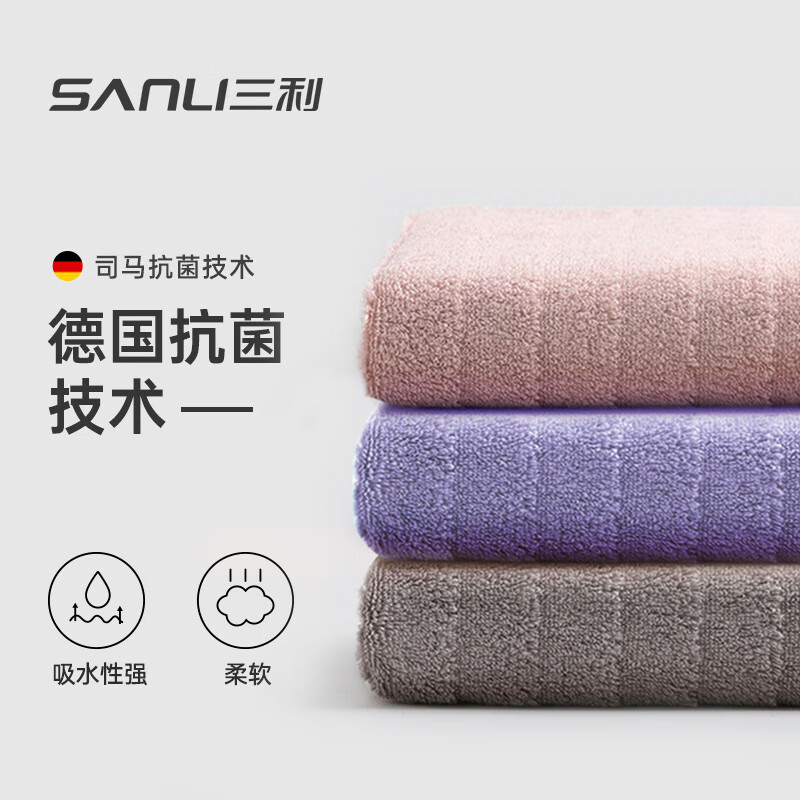 三利德国抗菌毛巾纯棉柔软洗脸家用吸水不掉毛男女加厚全棉面巾3条装 35*75cm 100G 粉紫灰