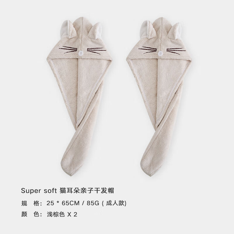 三利2条干发帽女强吸水速干儿童洗头擦头毛巾浴帽可爱干发包头巾 猫耳朵浅棕(成人2条)