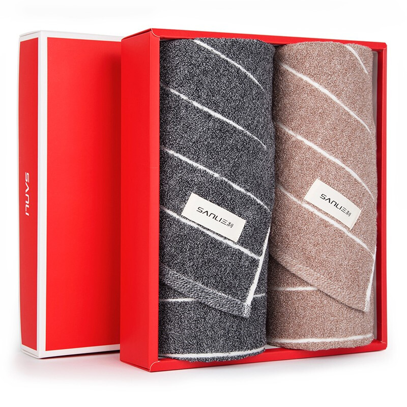 三利毛巾礼盒2条装 纯棉毛巾礼盒套装回礼伴手礼企业礼物员工福利礼品团购毛巾礼盒 横条缎档-棕色+黑色