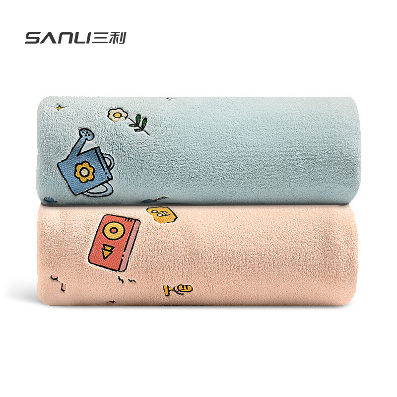 三利刺绣毛巾强吸水A类可爱风居家日用速干大毛巾2条 35*75cm 85G 湖蓝+贝粉