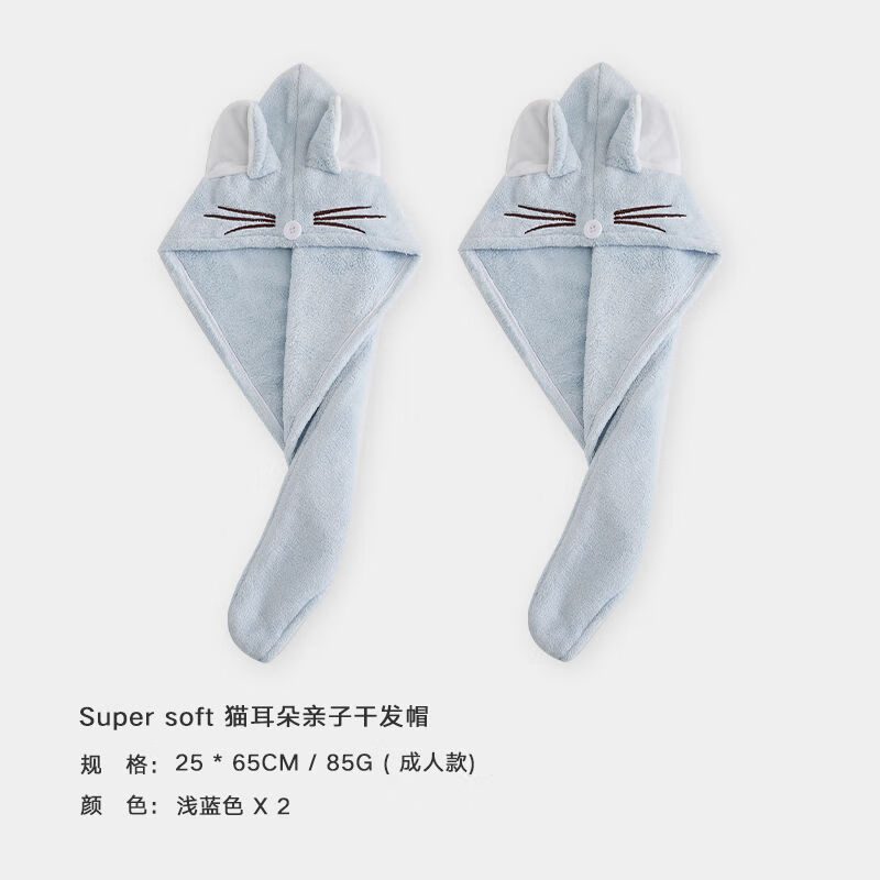 三利2条干发帽女强吸水速干儿童洗头擦头毛巾浴帽可爱干发包头巾 猫耳朵浅蓝(成人2条)