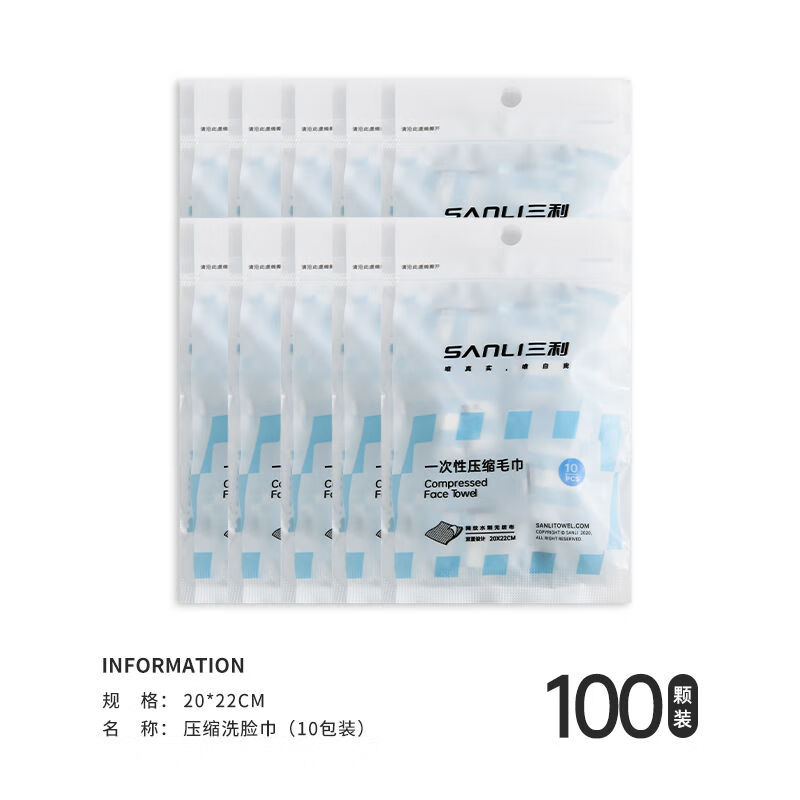三利压缩毛巾一次性洗脸巾旅行装颗粒压缩洁面巾加厚便携旅游用品 植物纤维袋装压缩毛巾10袋装