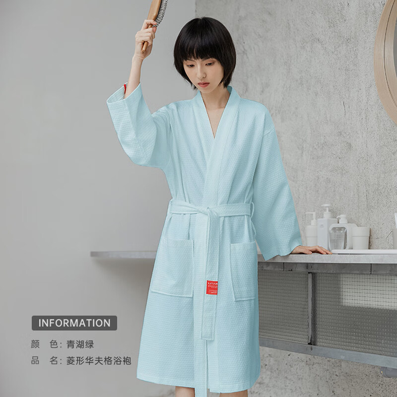 三利毛巾料浴袍女冬厚长款吸水速干纯棉华夫格情侣酒店全棉浴衣男 清湖绿(华夫格春夏款) L(适合身高175-190cm)