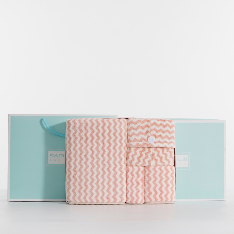 三利 毛巾礼盒装 珊瑚绒毛巾套装 柔软吸水洗脸面巾 粉色(方巾+毛巾+浴巾+浴帽)