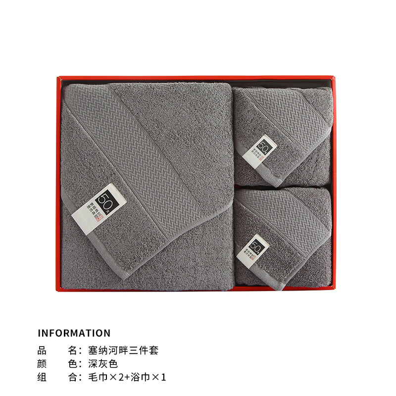 三利纯棉毛巾加大加厚面巾礼盒2条装套件红色绣花定制结婚 深灰色3件套(红色礼盒) 78x34cm