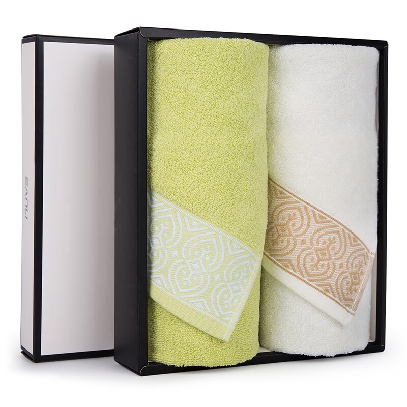 三利毛巾礼盒2条装 纯棉毛巾礼盒套装回礼伴手礼企业礼物员工福利礼品团购毛巾礼盒 缎边提花-米色+绿色