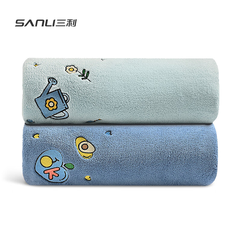 三利刺绣毛巾强吸水A类可爱风居家日用速干大毛巾2条 35*75cm 85G 湖蓝+天蓝