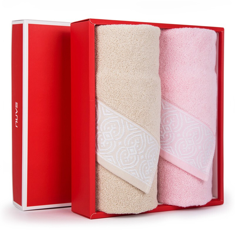 三利毛巾礼盒2条装 纯棉毛巾礼盒套装回礼伴手礼企业礼物员工福利礼品团购毛巾礼盒 缎边提花-棕色+粉色