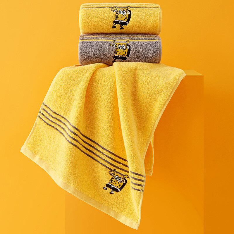 三利海绵宝宝纯棉毛巾2条装 卡通家用吸水男女柔软洗脸面巾 灰色/黄色 34*73cm